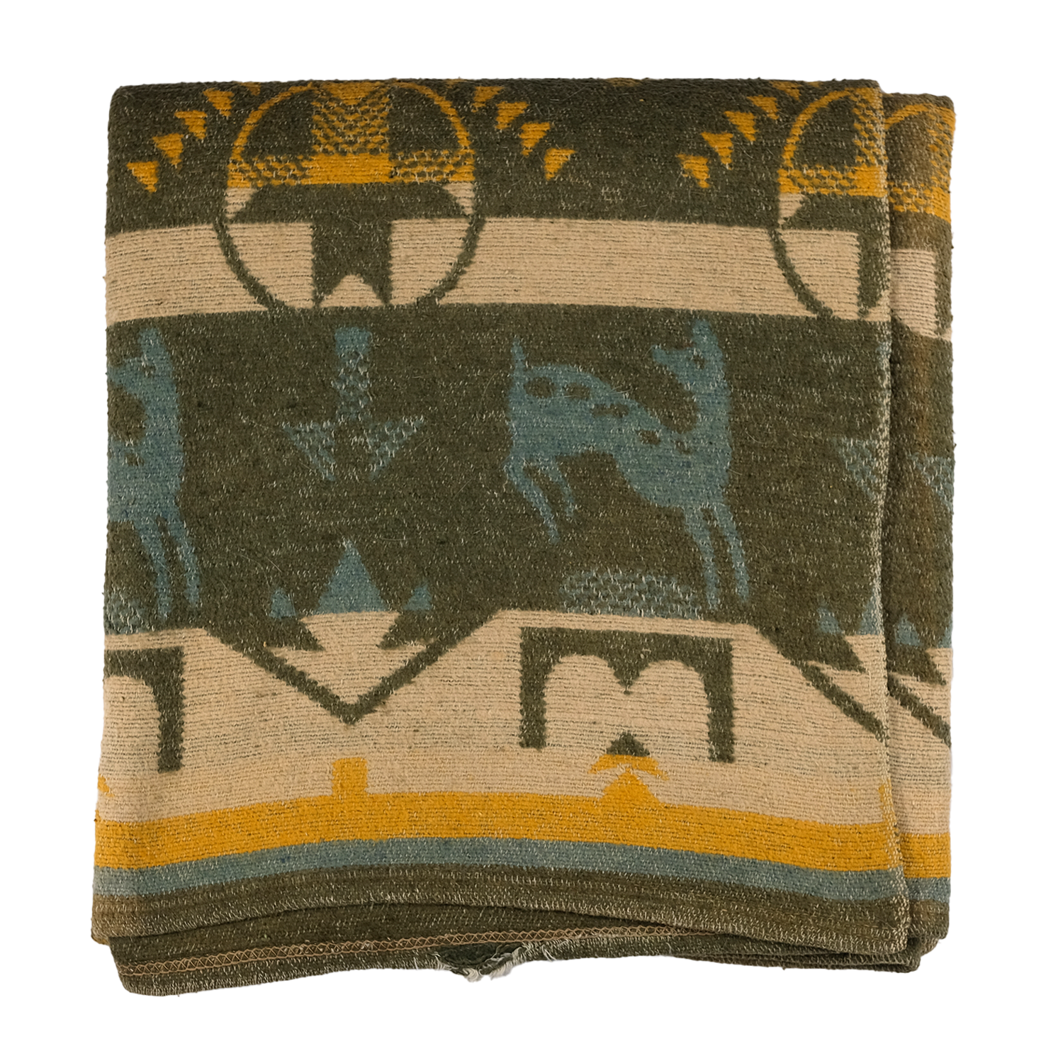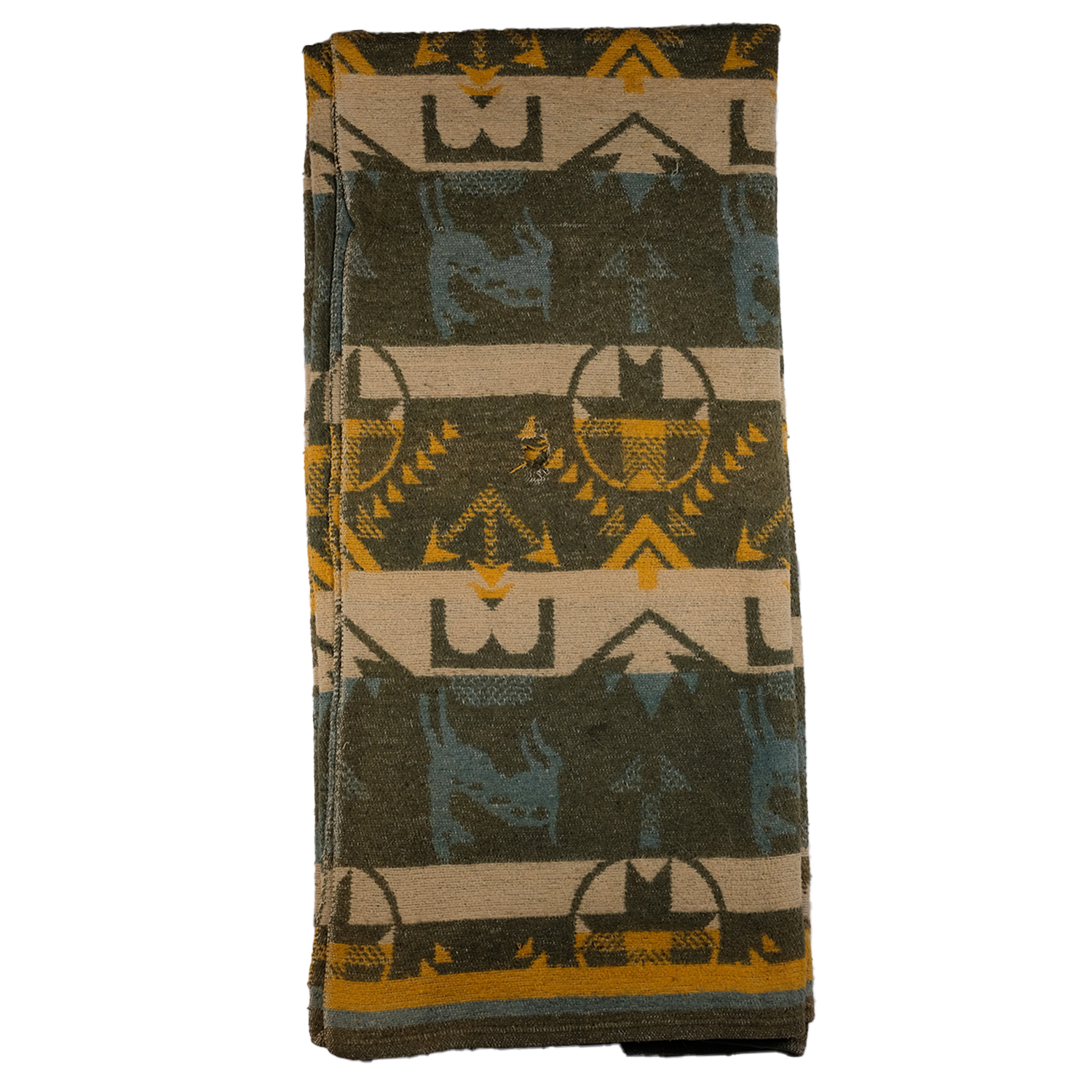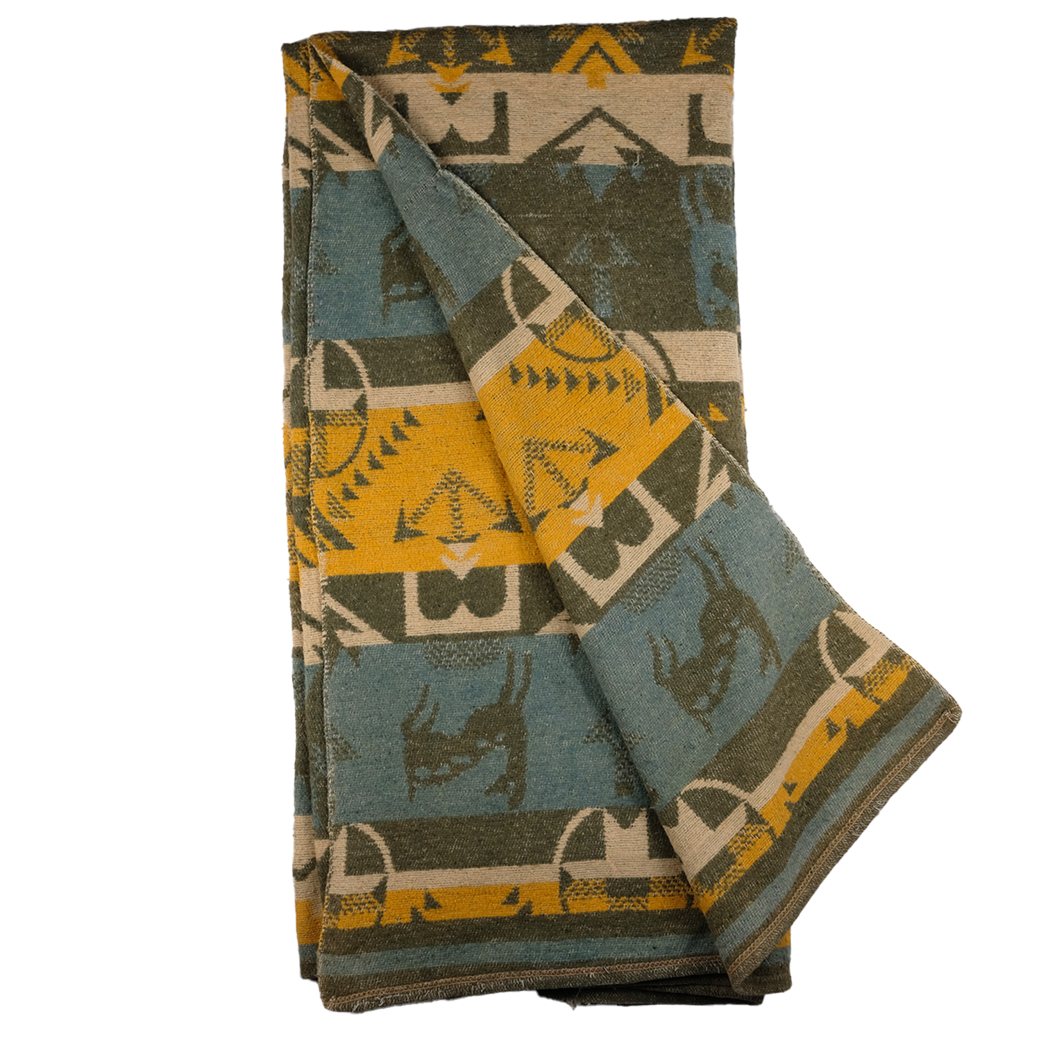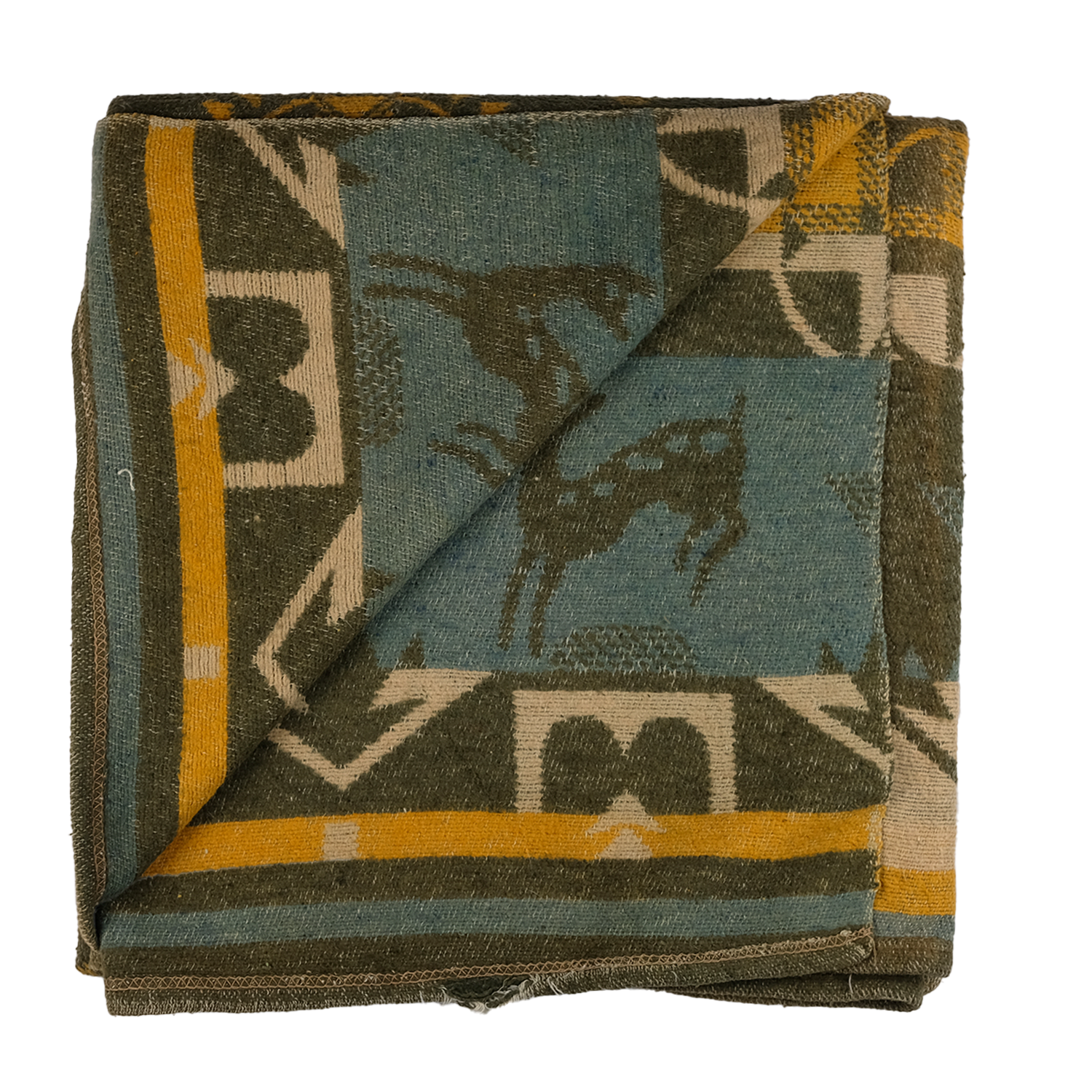 This 1940s Camp Blanket, adorned with geometric patterns, arrowheads and deer imagery, is a distinctive piece that embodies the rich tapestry of Southwestern design. This blanket features a harmonious blend of greens, mustards, and creams, creating a warm and inviting aesthetic.