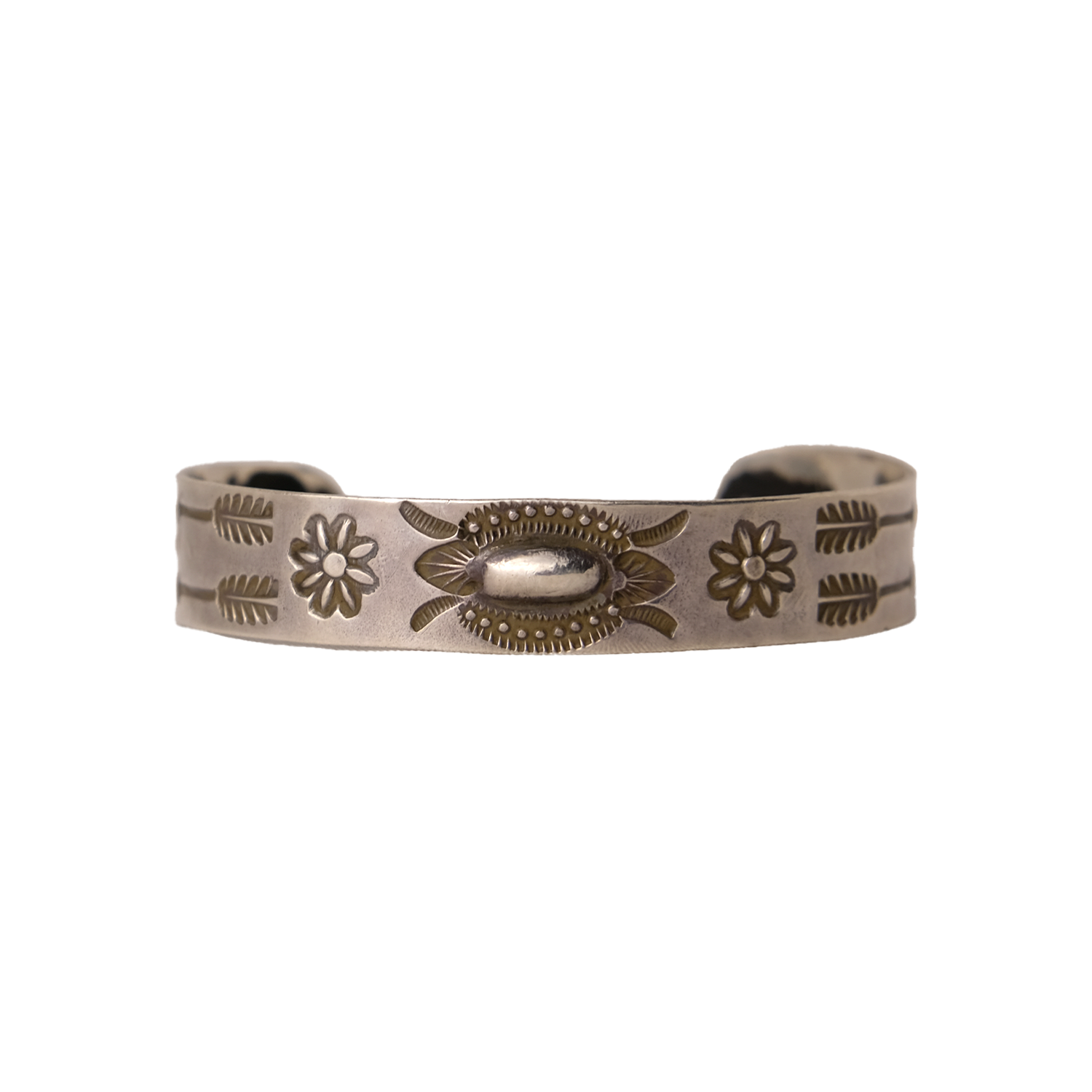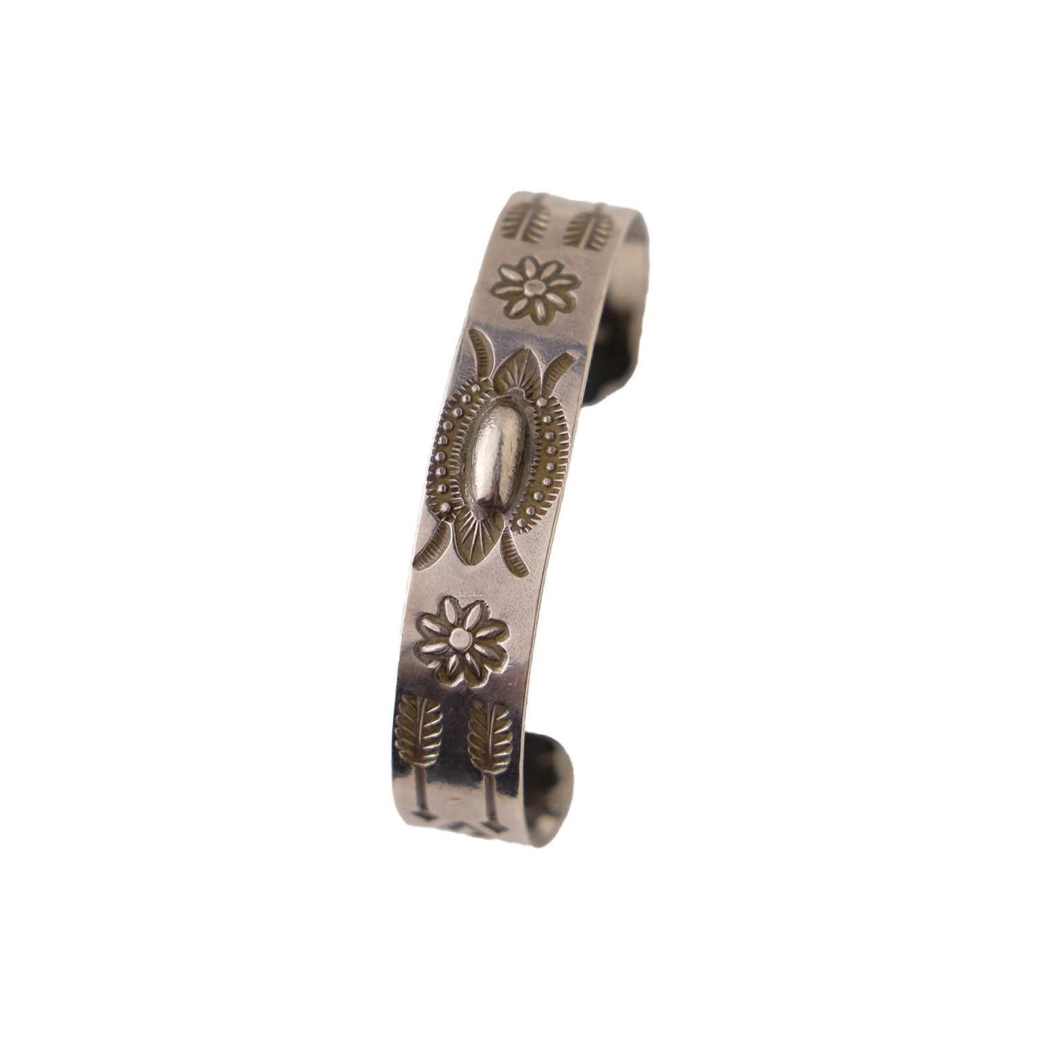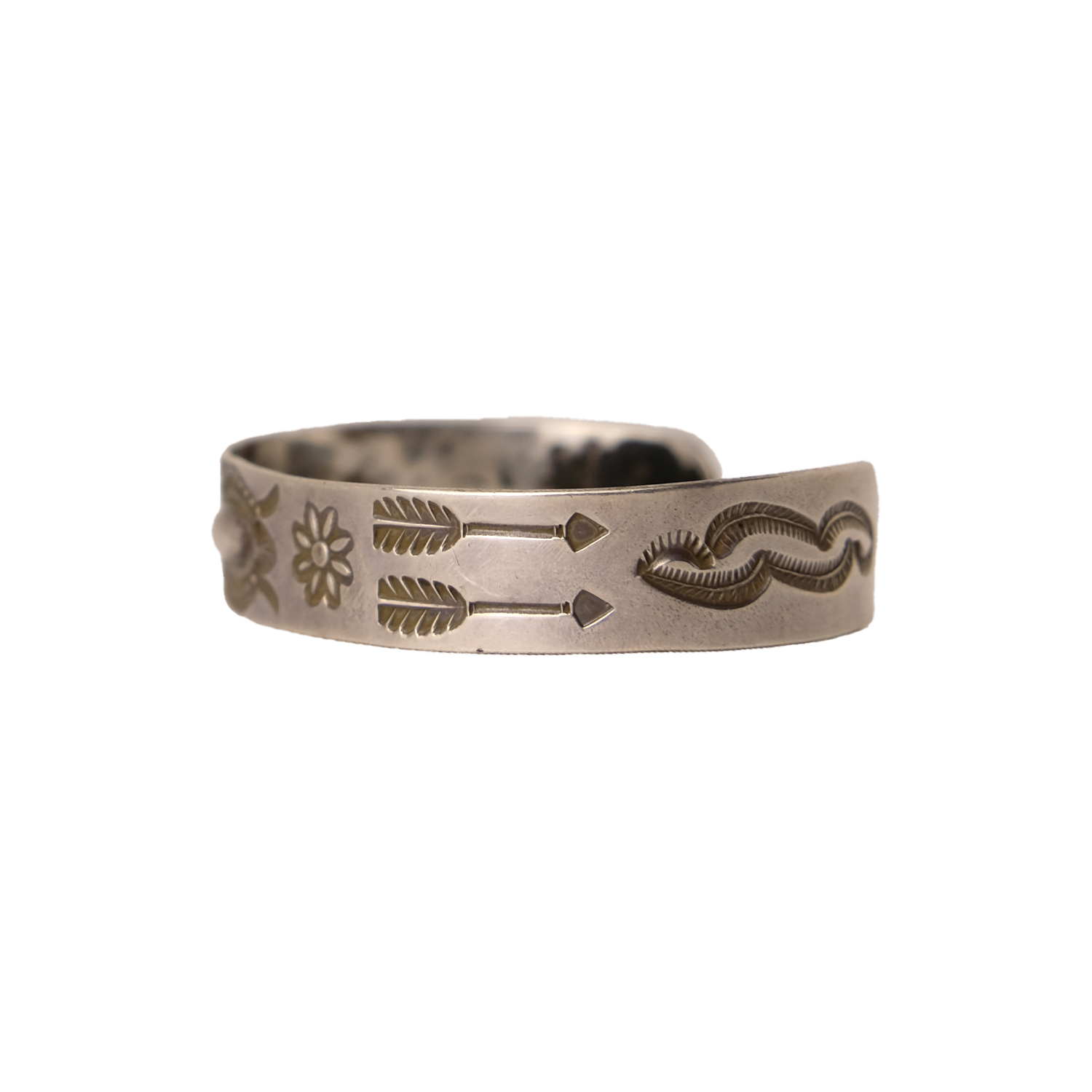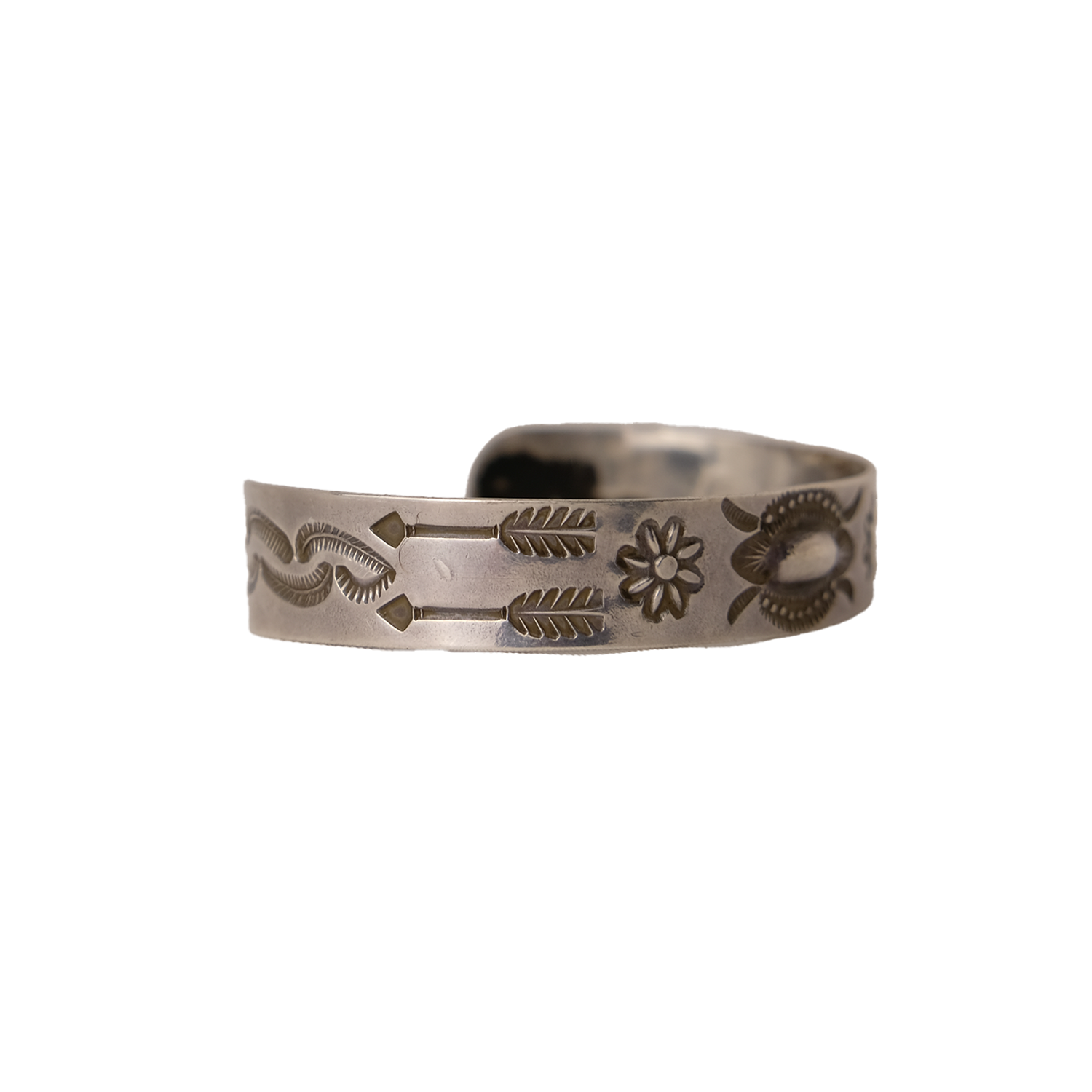 Add a touch of silver with this vintage cuff, featuring hand stamped design with motifs such as flowers and feathered arrows. Fits wrist of up to 7"