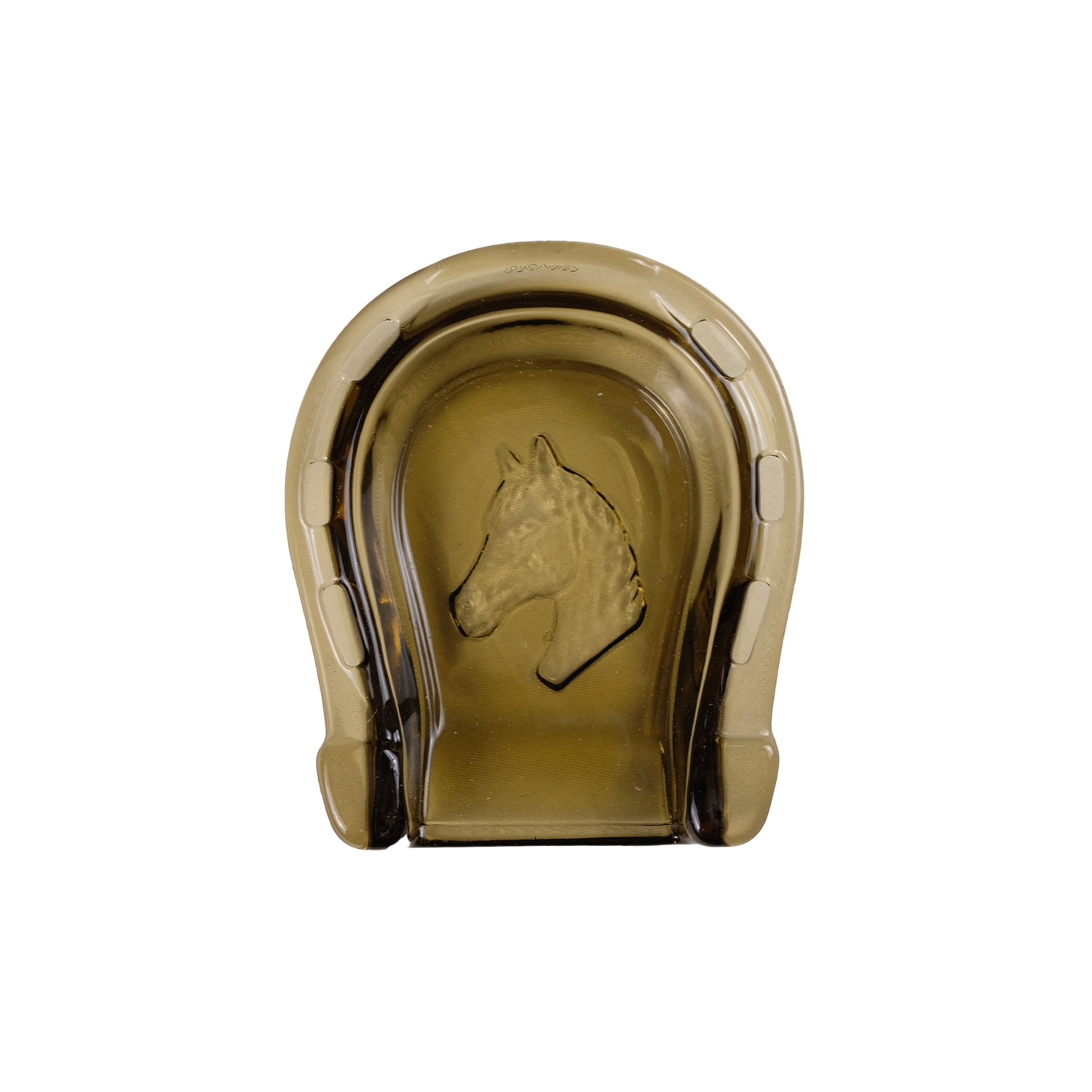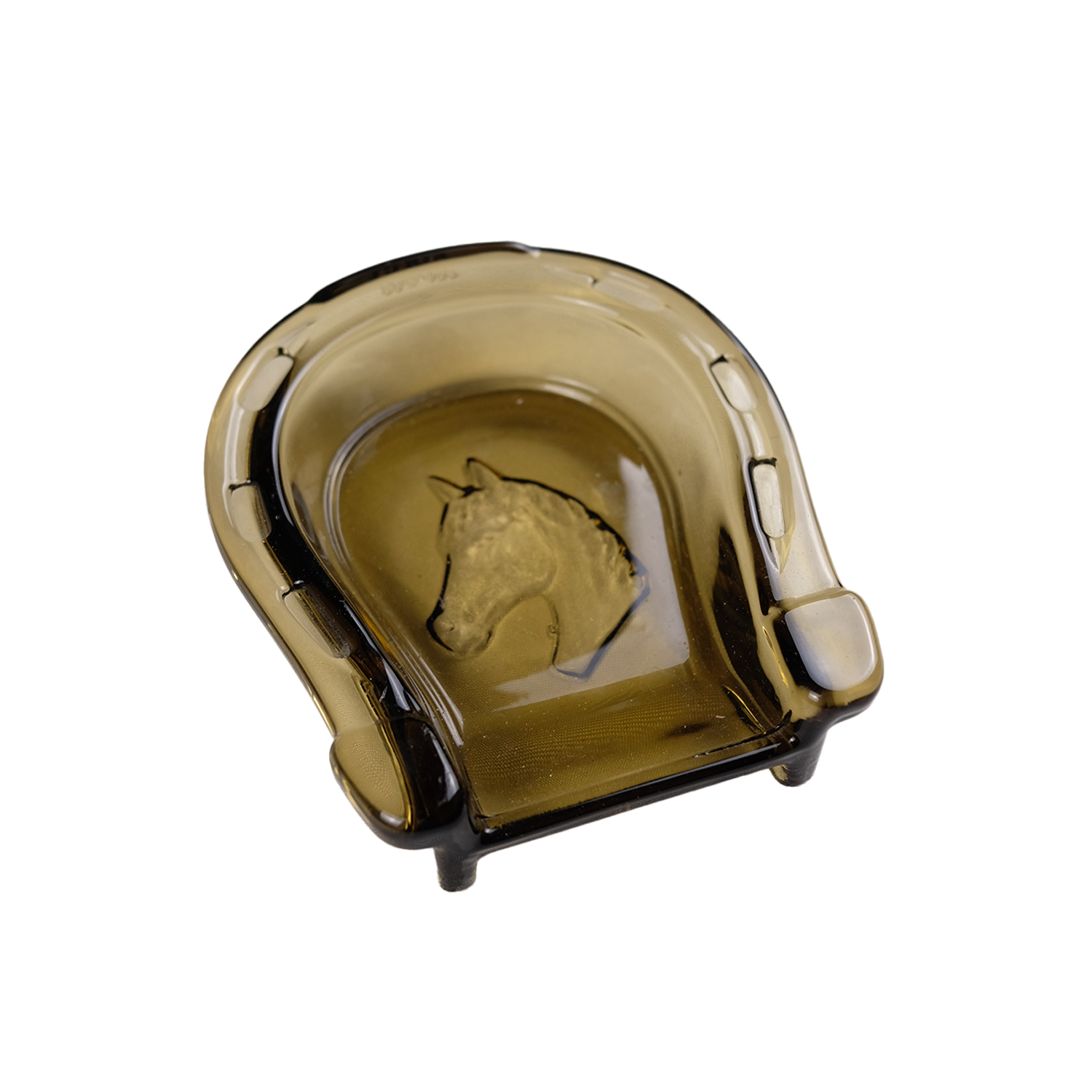 This vintage soap dish is made from sturdy smoked grey glass, shaped like a horseshoe with a horse head motif inside. A charming accent for any rustic or Western-themed space. Use as an ring dish, ashtray or in your bathroom for its intended use, I don't care!