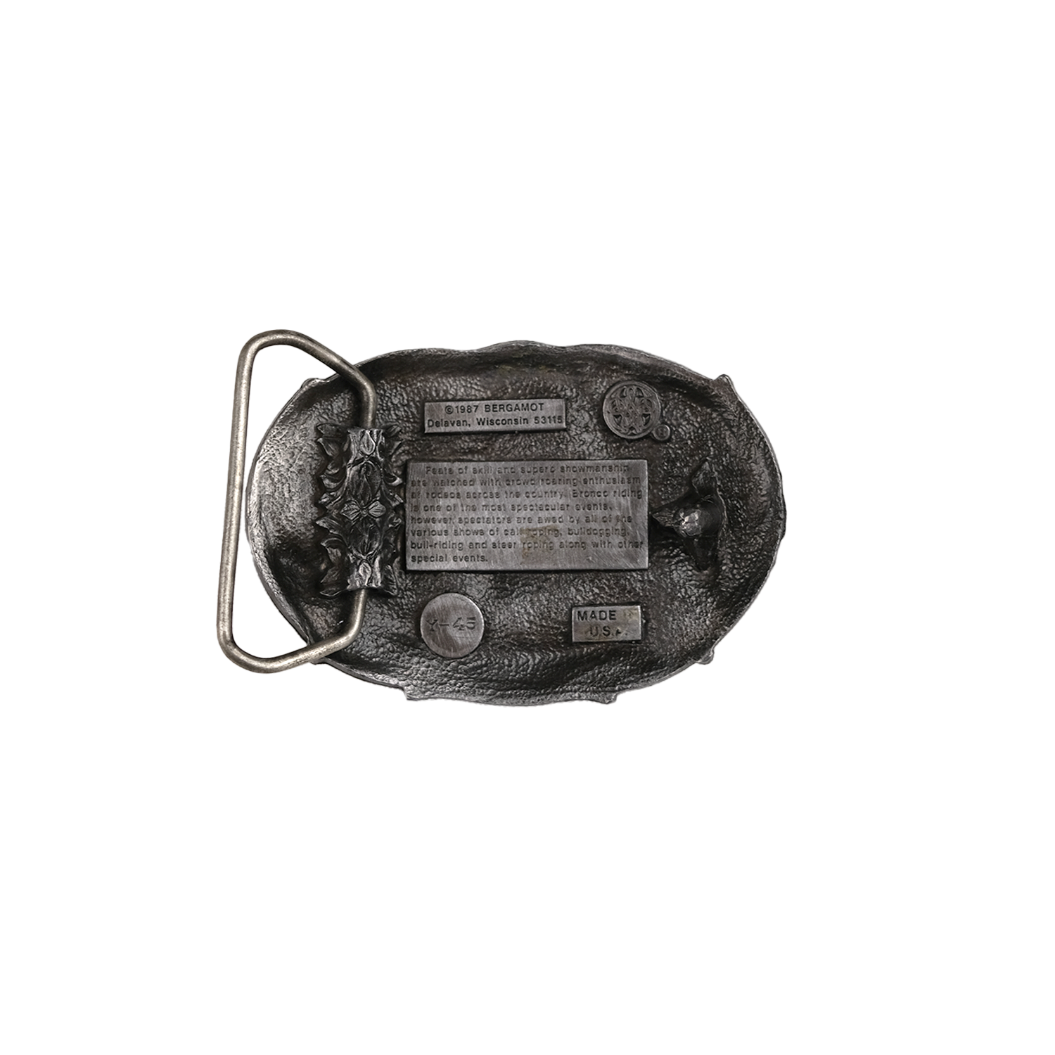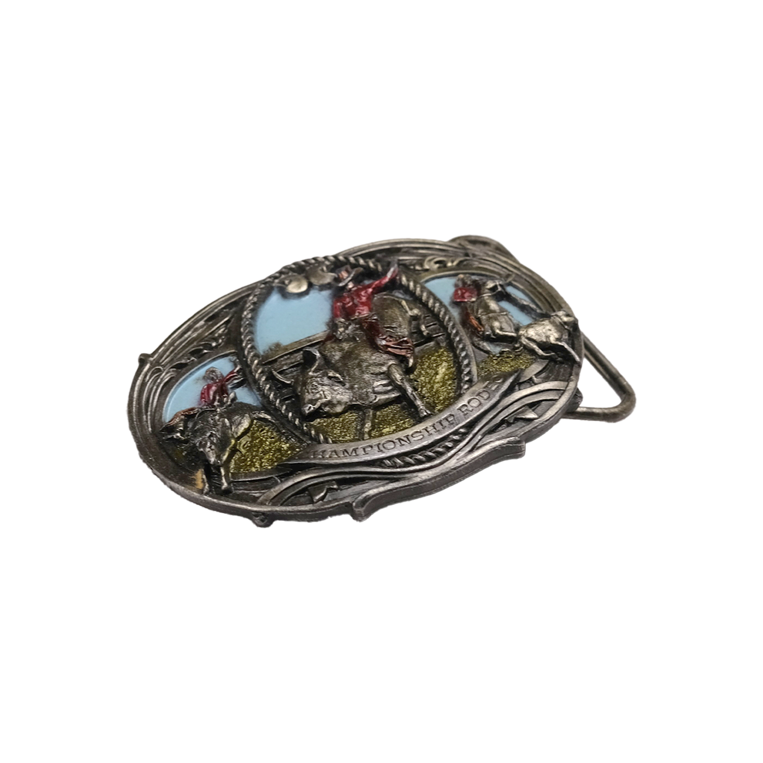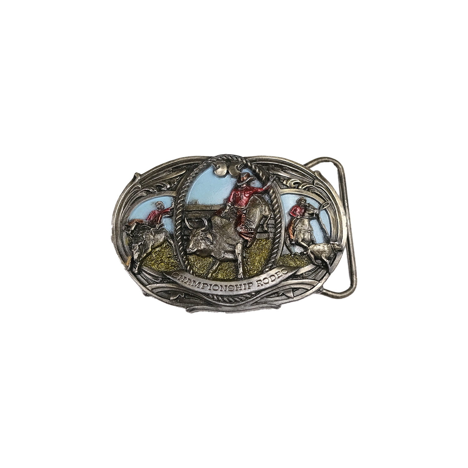 This rodeo championship buckle is crafted from solid metal, featuring coloured enamel detailing representing three rodeo events, Calf Roping, Bronc Riding and Bull Riding. Standard 1.5 inch belt swivel.