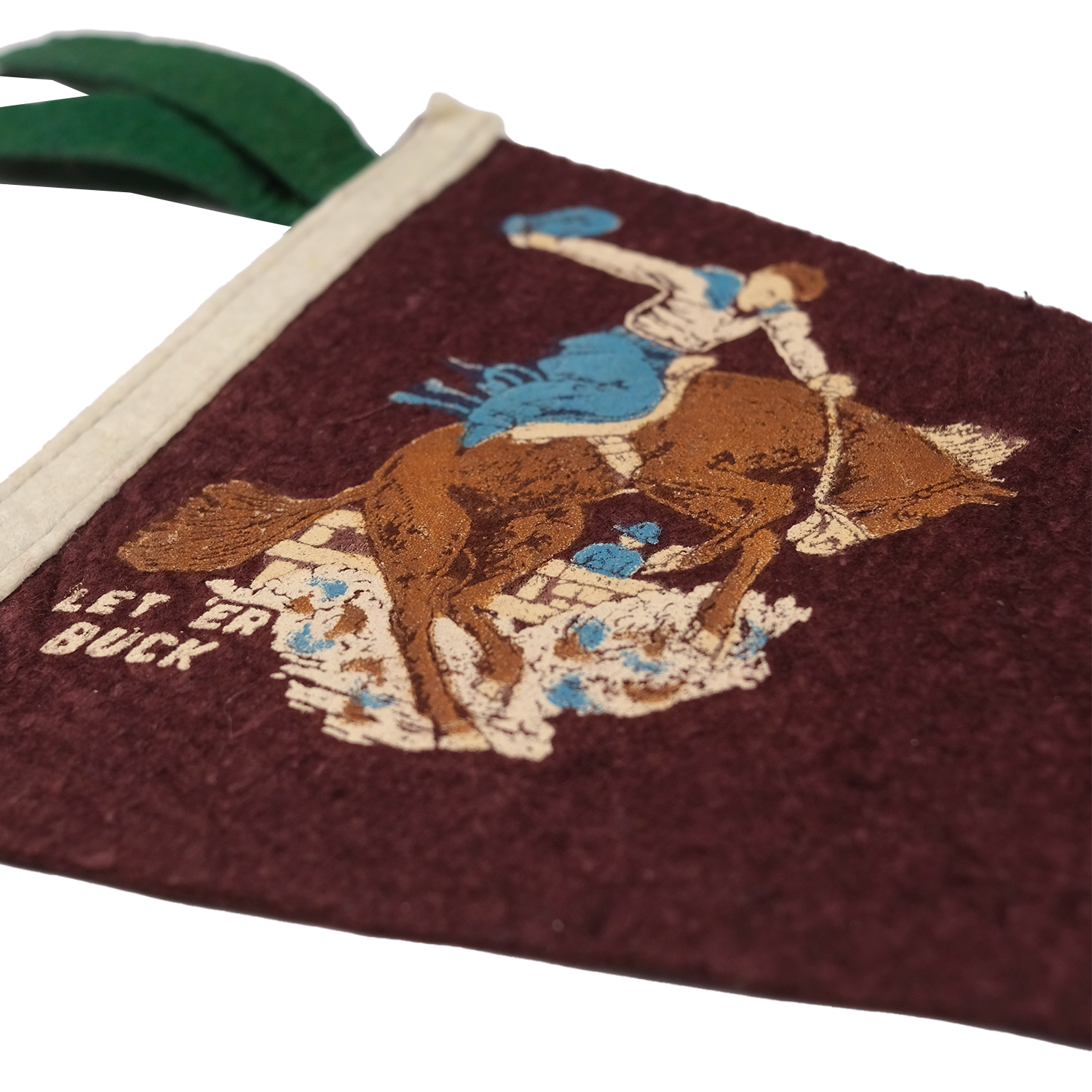 - Printed bucking cowboy design on warm brown felt pennant