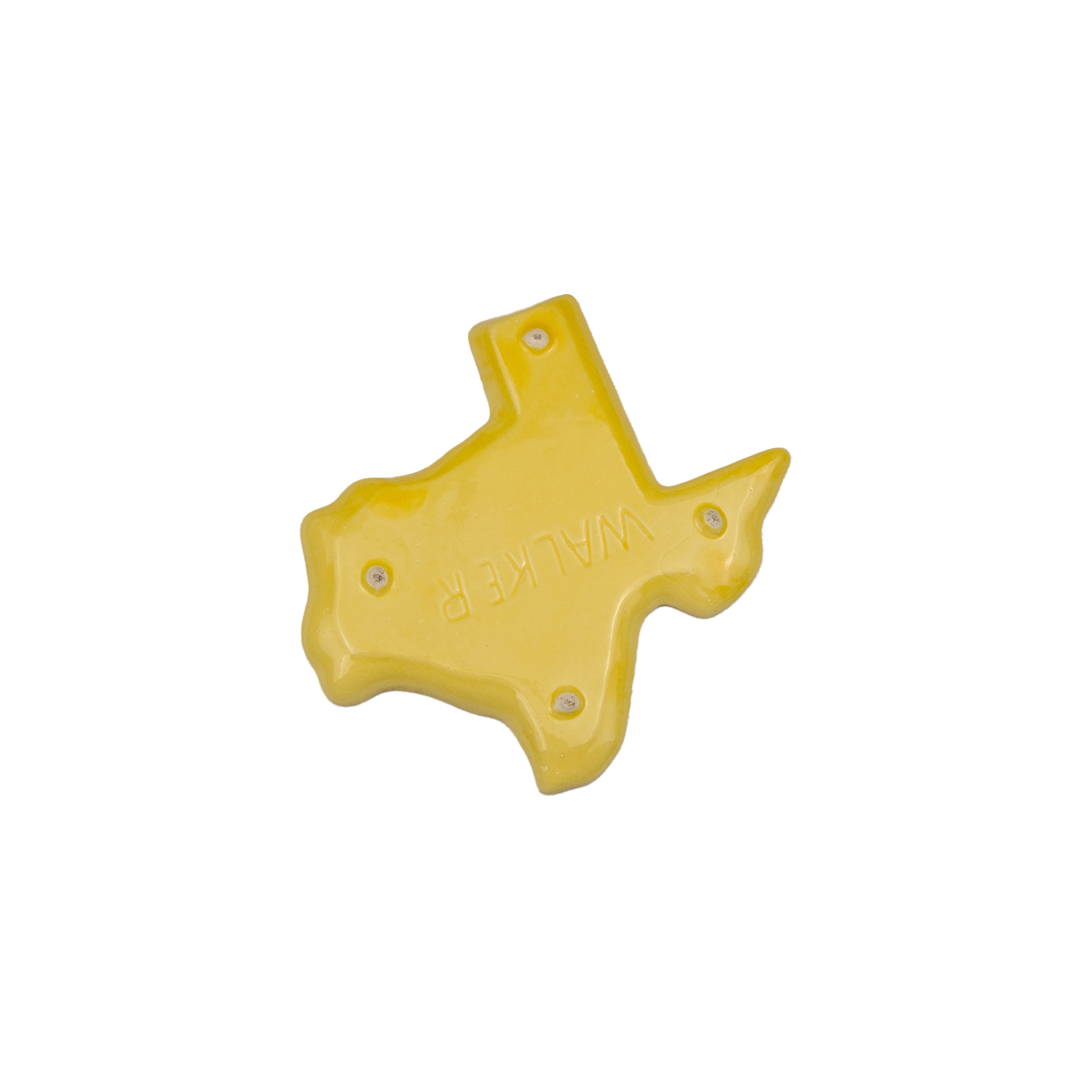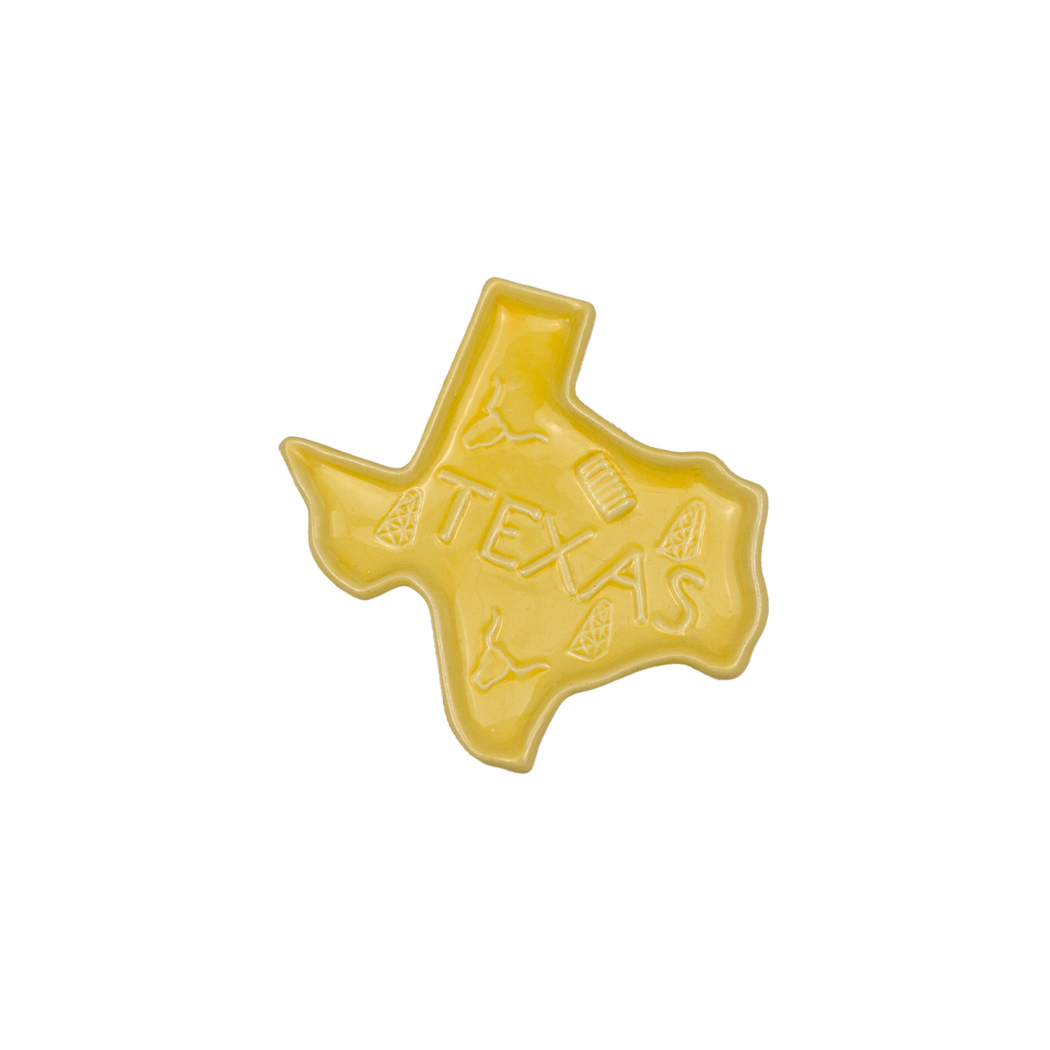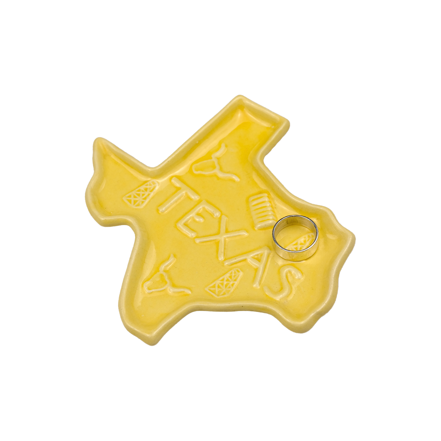 A ceramic trinket dish in yellow glaze shaped like the state of Texas, use it for rings, burning incense or stubbing out your cigarettes in.